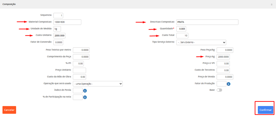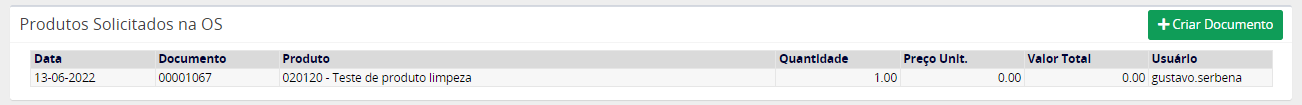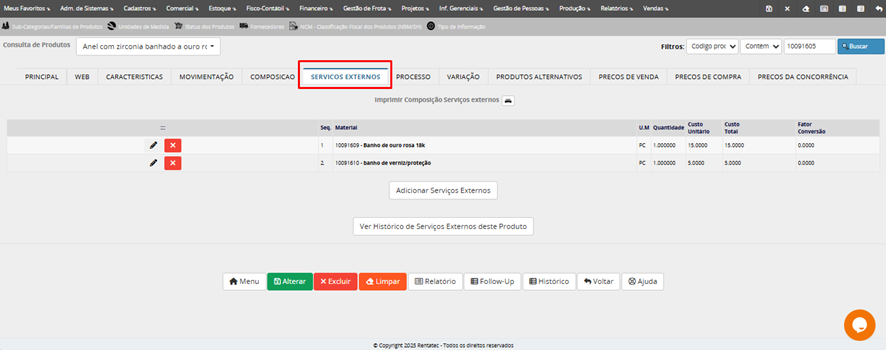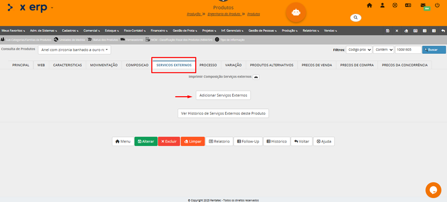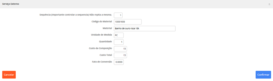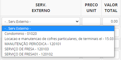 No cadastro do formulário de Serviço Externo selecionamos o produto, indicamos a quantidade, o serviço previamente cadastrado e o sistema já deve informar o valor unitário assim como o total do serviço.