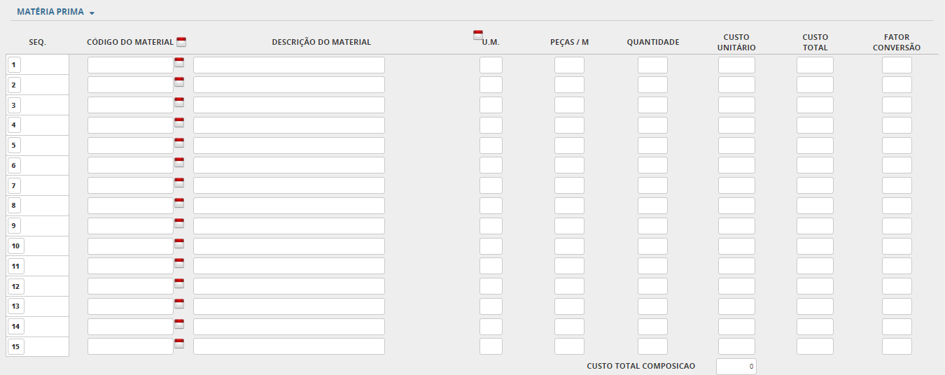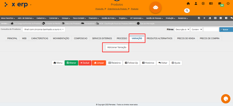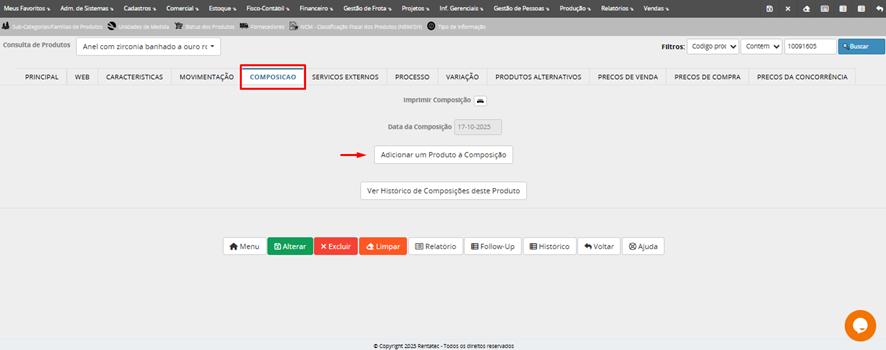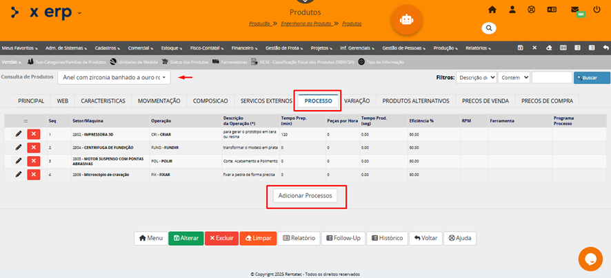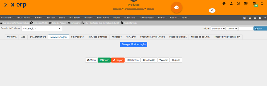 O programa Cadastro de Produtos, tem como objetivo cadastrar os produtos da empresa. Neste programa também cadastramos suas composições e processos, preços de venda, de compra e serviços externos destacam-se entre as principais informações. Produtos podem ser a matéria-prima, os produtos acabados, os materiais de estoque, os instrumentos de medição, tudo que a empresa quer ter controle de estoque e/ou vendas.