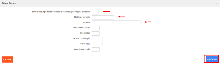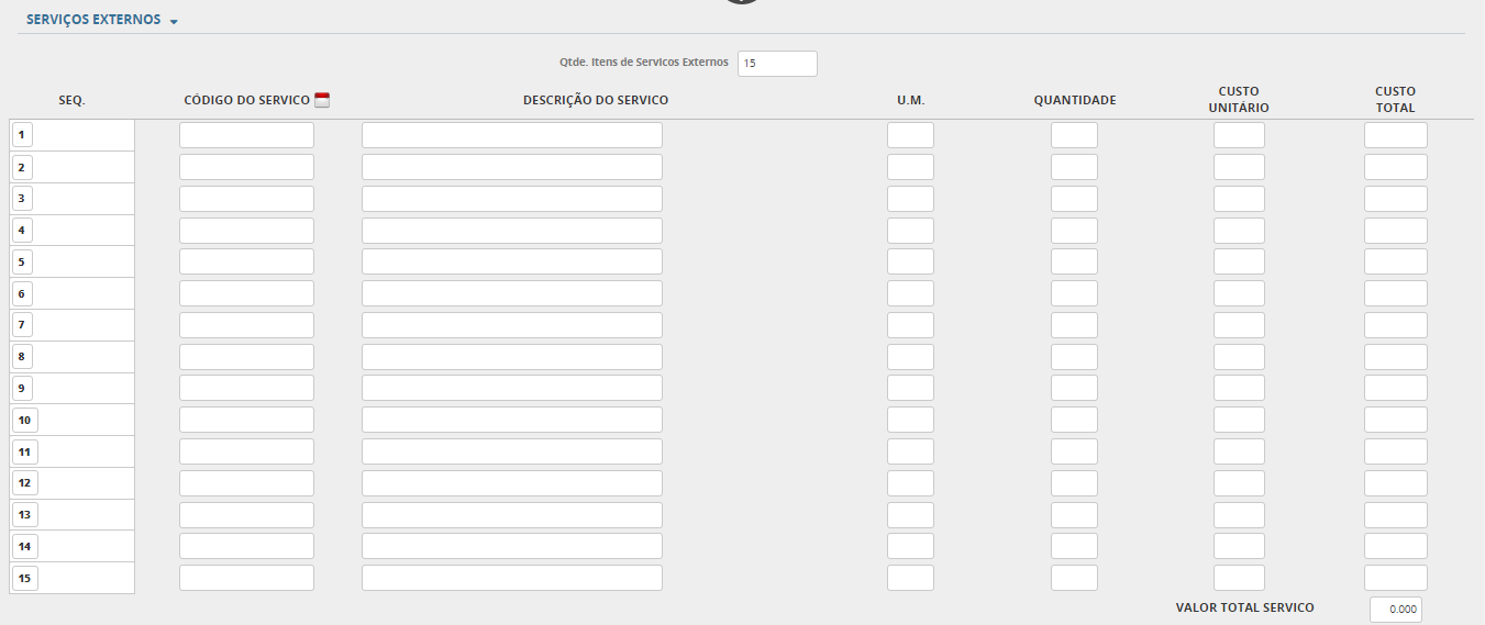 A maioria dos campos são auto explicativos com informações básicas sobre o item como descrição, código, quantidade, data, etc. Um campo a ser destacado é o tipo de Serviço Externo que deve ser cadastrado pela empresa.