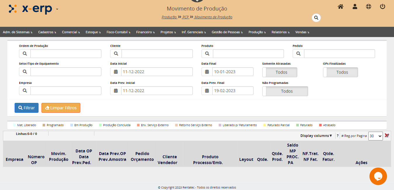 No menu principal, selecione: Produção > PCP > Recebimento de Produção