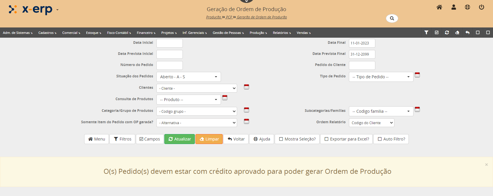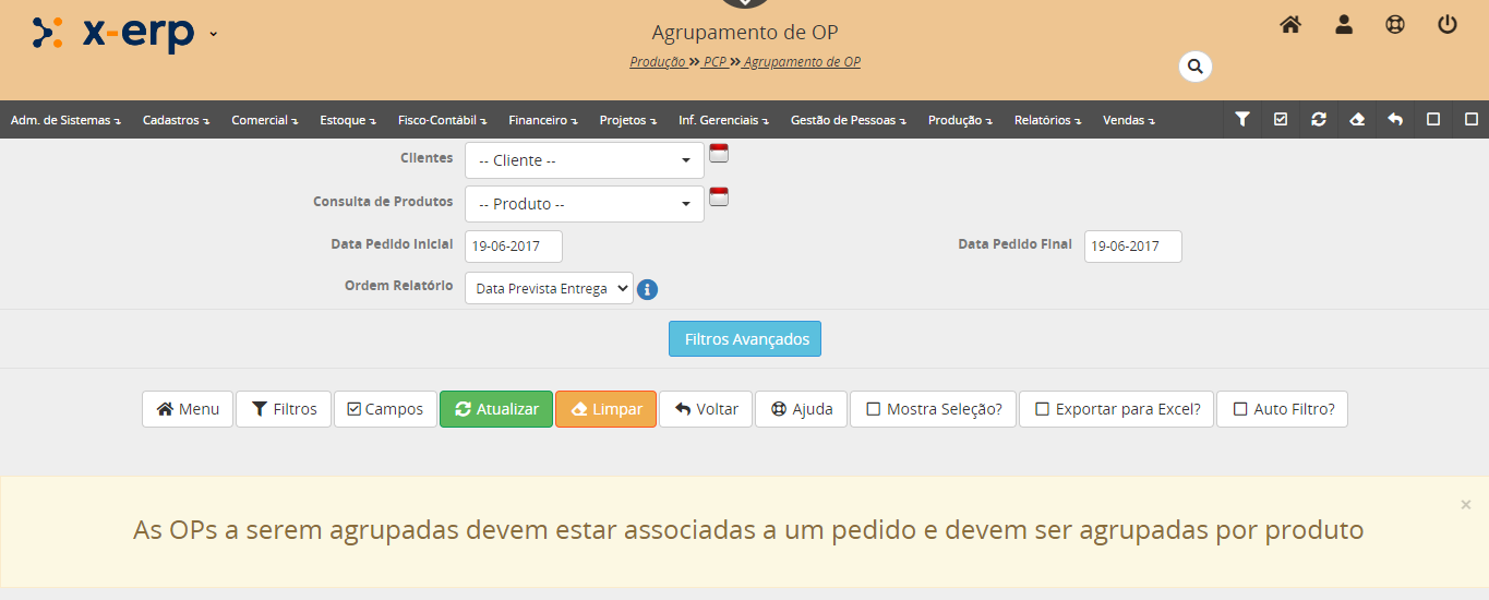 O formulário agrupamento de OP permite vários filtros para seleção das OP´s geradas no sistema.