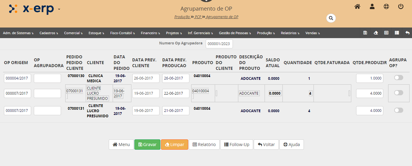 Na sequência podemos ver a nova OP 000007/2017 gerada e na aba Composição da OP a lista de OP´s agrupadas.