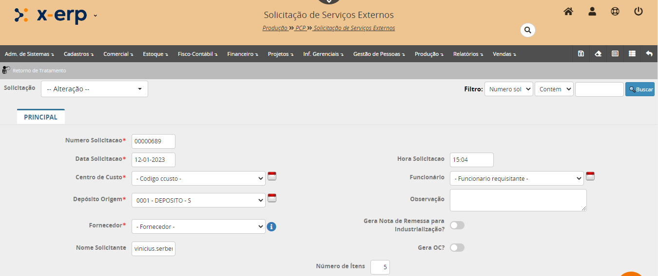 Numero solicitação: Número sequencial da solicitação gerado automaticamente pelo sistema (pode ser alterado).