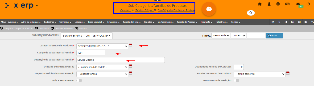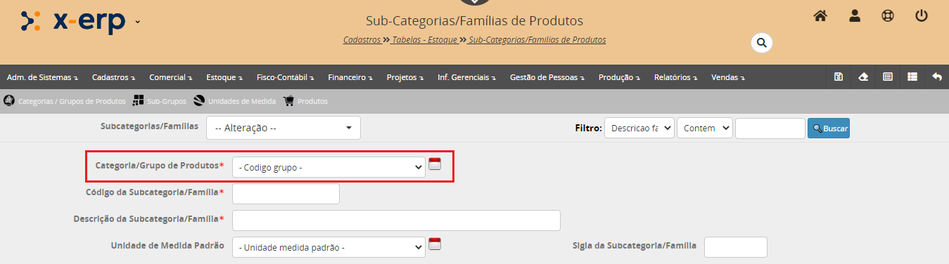 No cadastro da família de produtos, selecione o grupo de produtos criado anteriormente.