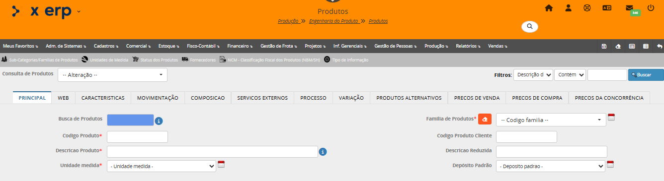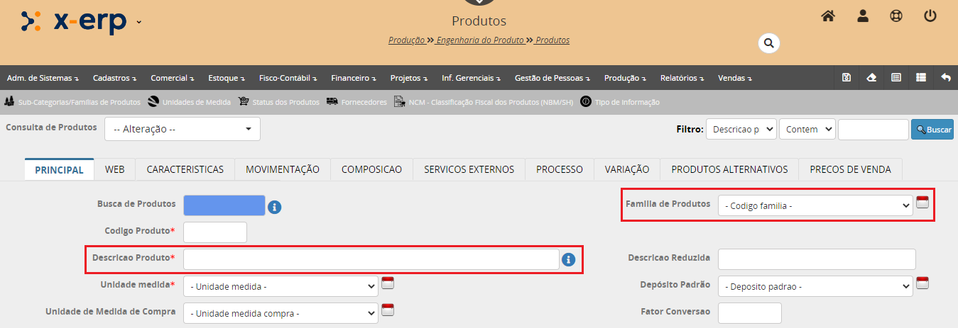 Para cadastrar um novo produto, iniciar pelo campo Família de Produtos.