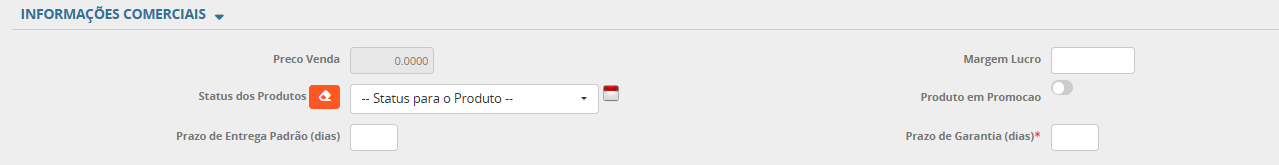 Margem lucro: Estimativa de lucro bruto esperado para venda do produto. Este campo não é editável. Esta informação é calculada com base no preço de custo e preço de venda. Pode ser ajustado somente no Acompanhamento de Entrada de Notas Fiscais.
