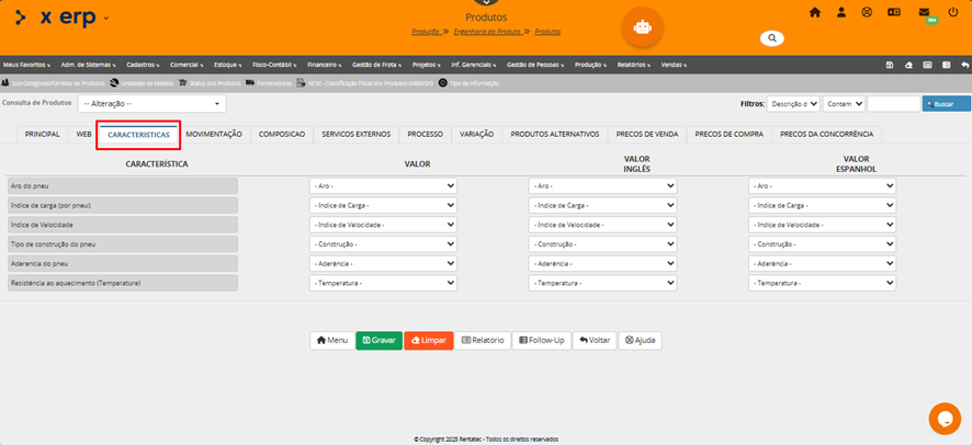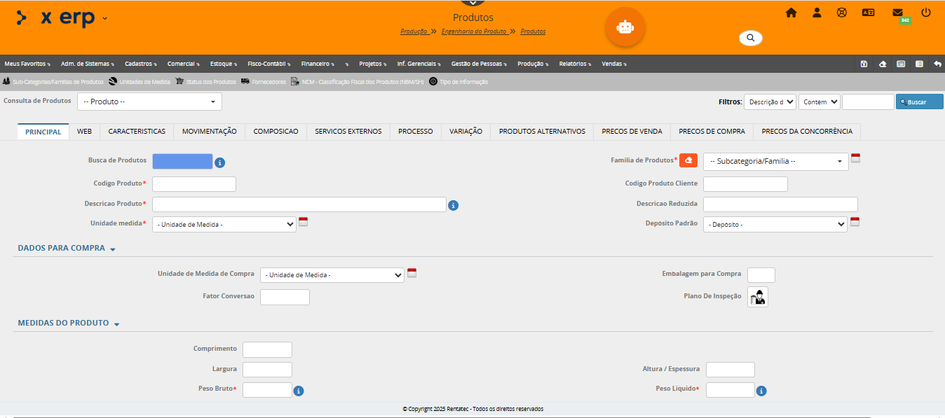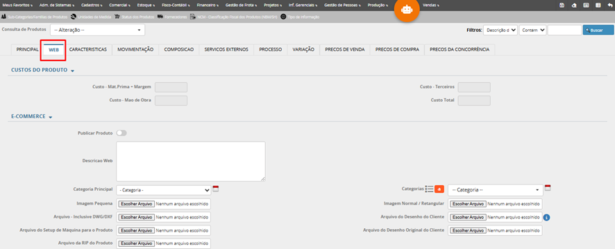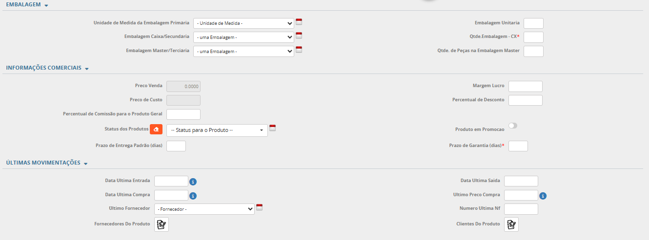 A página de cadastro de produto é bastante extensa e possui 12 abas para uma configuração completa do produto que podem variar de acordo com a configuração para cada empresa/usuário. Apesar de algumas abas solicitarem informações especificas e para propósitos específicos, é muito recomendado que o usuário preencha com cuidado todos os campos solicitados.