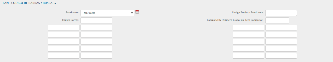 Busca de Produtos: Campo utilizado para busca/consulta de um produto. O sistema irá proceder a busca, e se o mesmo estiver cadastrado será listado em tela. Pode ser realizada a pesquisa pelo código do produto no sistema, código de barras, código do produto no fabricante ou ainda código do produto no cliente.