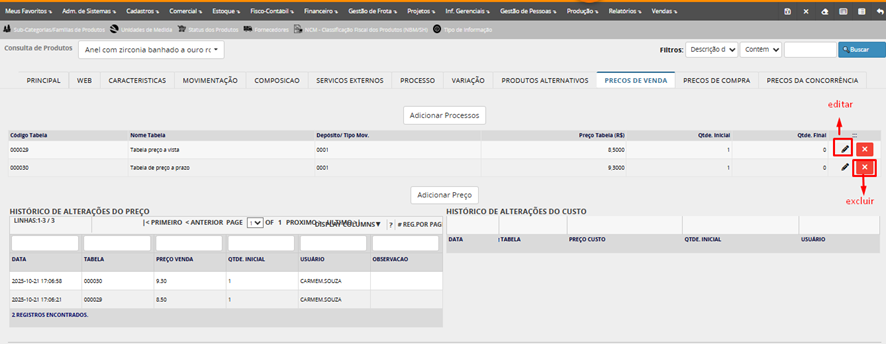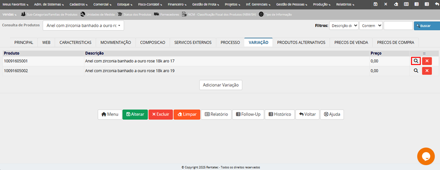 A partir da busca é possível consultar, alterar ou clonar um produto já existente.