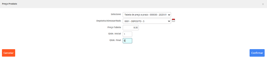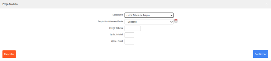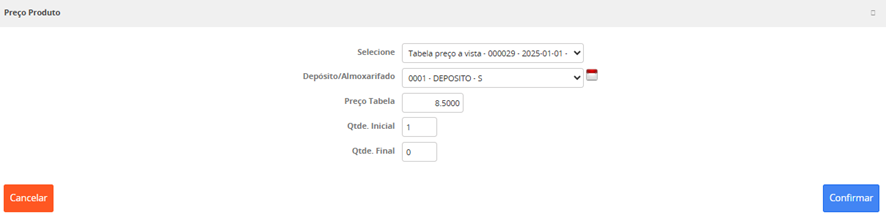 Preço venda: Este campo estará visível caso esse produto não esteja com preço vinculado a mais de uma tabela de preço. Este campo não é editável. Calculado conforme "Preço de custo" e "Margem de Lucro" informados no "Acompanhamento de Entrada de Notas Fiscais".