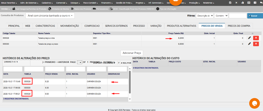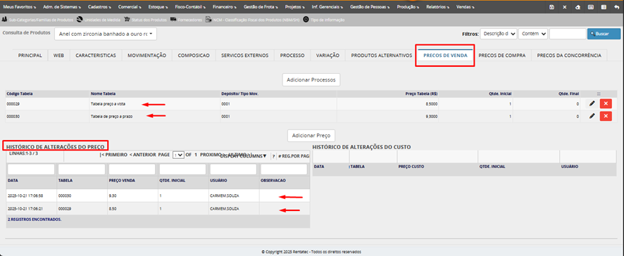 Preco de Custo: Este campo mostra o custo do produto relativo a ultima entrada, o custo informando/ajustado no "Acompanhamento de Entrada de Notas Fiscais" ou em Documentos de Estoque/importação de XML.