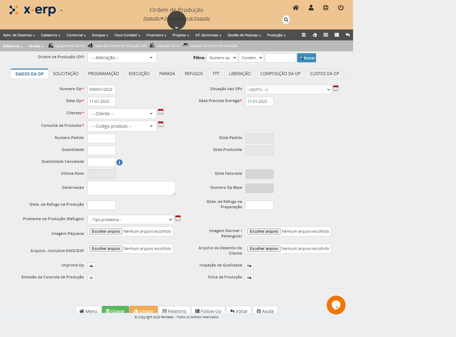 O formulário de liberação de OP traz informações sobre a geração da OP como: Número da OP, Cliente, Produto produzido, etc.