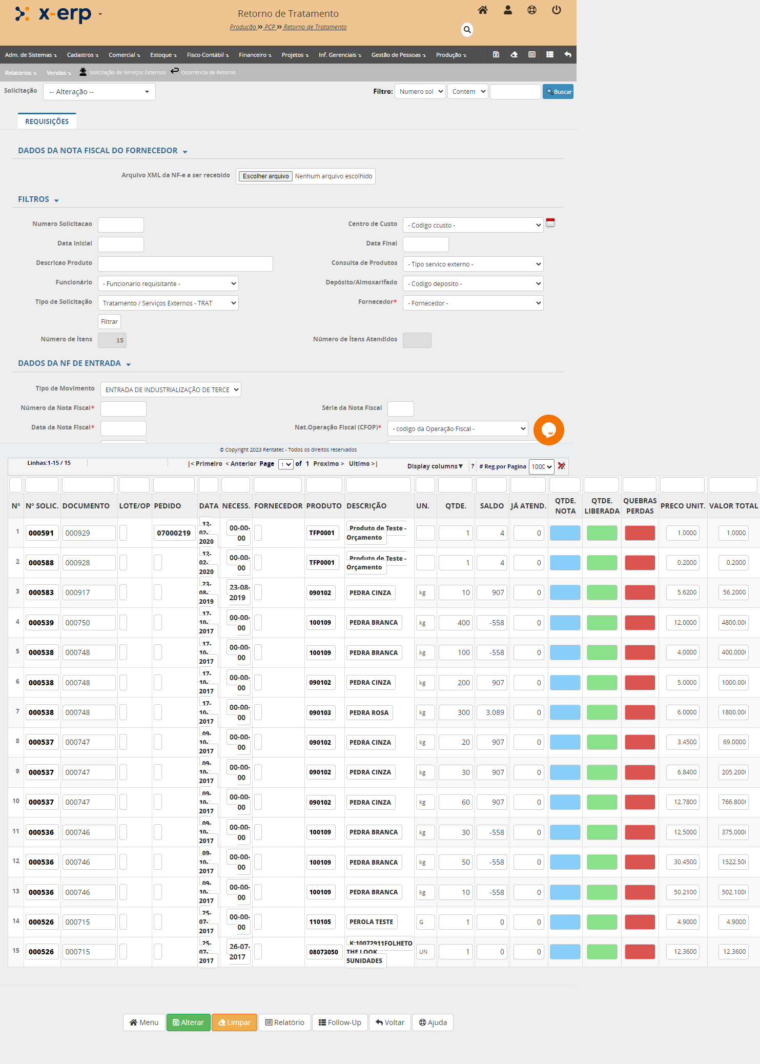 O formulário de retorno de tratamento tem três blocos de informações: Filtro, Dados da NF de entrada e a relação de itens enviados para tratamento externo.