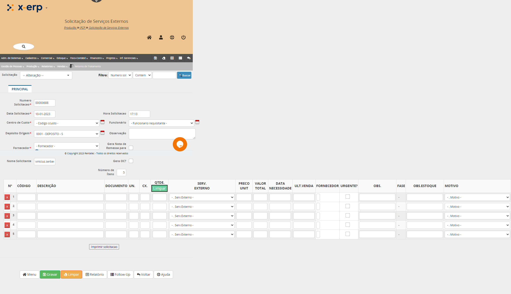 O programa Solicitação de Serviços Externos tem como objetivo emitir uma ordem de serviço para uma empresa terceira, solicitando algum tipo de serviço que a empresa não disponibiliza no momento.